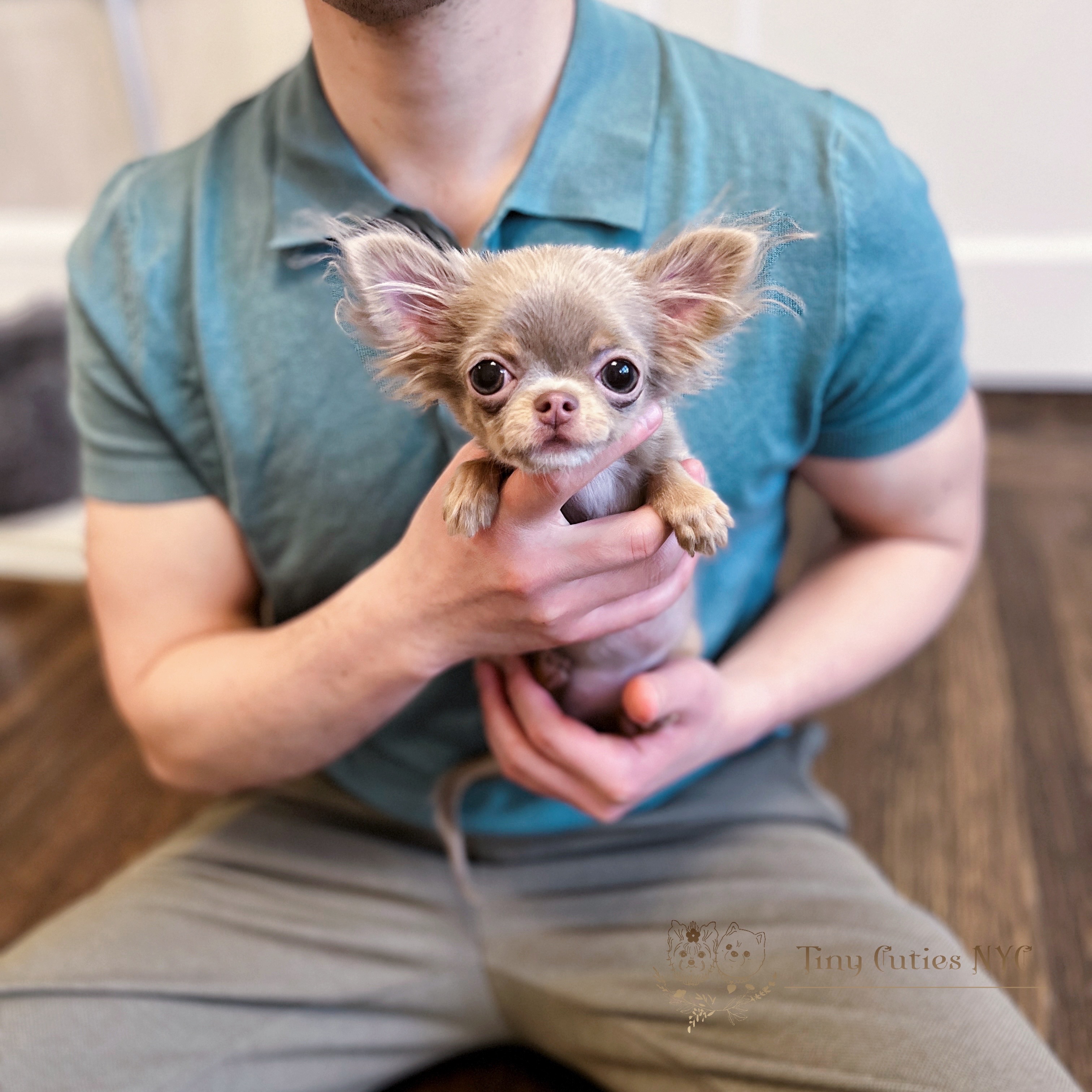 Extremely tiny and cute Isabella Longhair Chihuahua girl with beautiful apple head, big eyes, super short snout and excellent temperament. Estimate 3 lbs in adult size.
